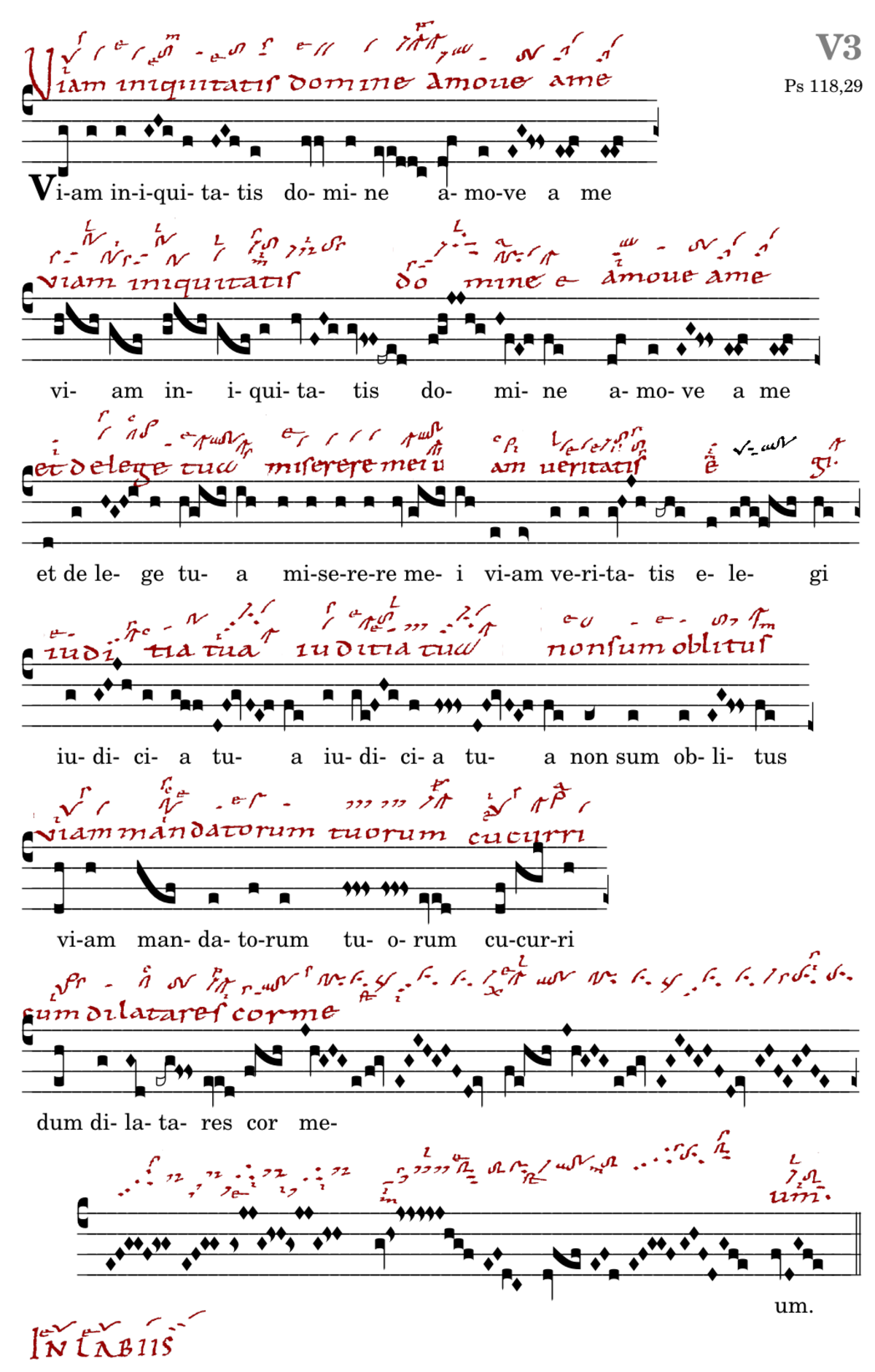 V3. Viam iniquitatis domine amove a me / viam iniquitatis domine amove a me / et de lege tua miserere mei viam veritatis elegi / iudicia tua / iudicia tua non sum oblitus / viam mandatorum tuorum cucurri / dum dilatares cor meum.