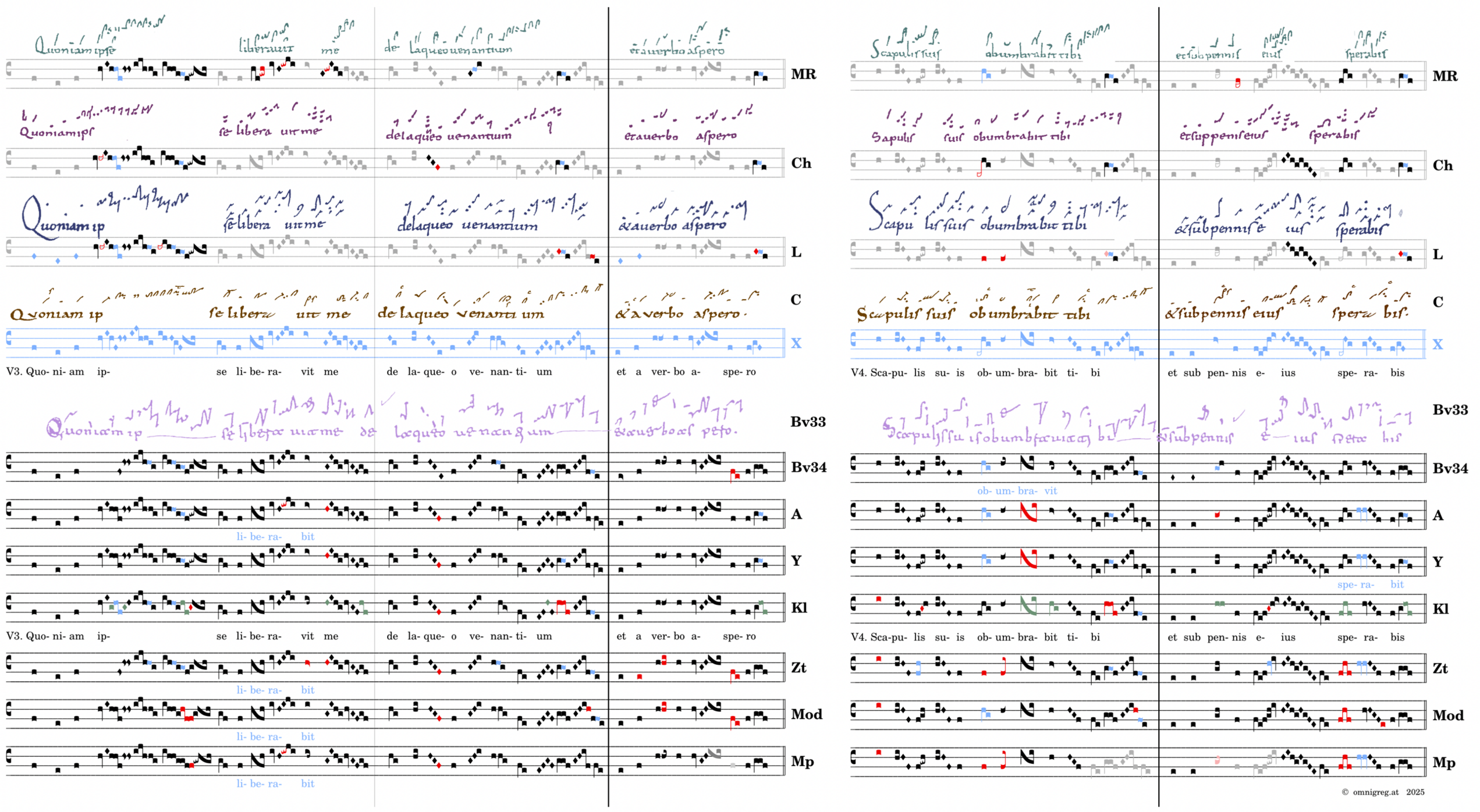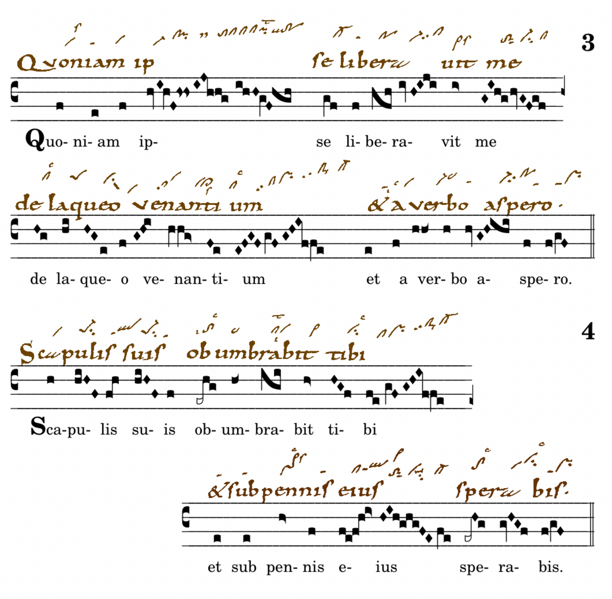 V3. Quoniam ipse / liberavit me * de laqueo venantium / et a verbo aspero. V4. Scapulis suis / obumbrabit tibi * et sub pennis eius sperabis.