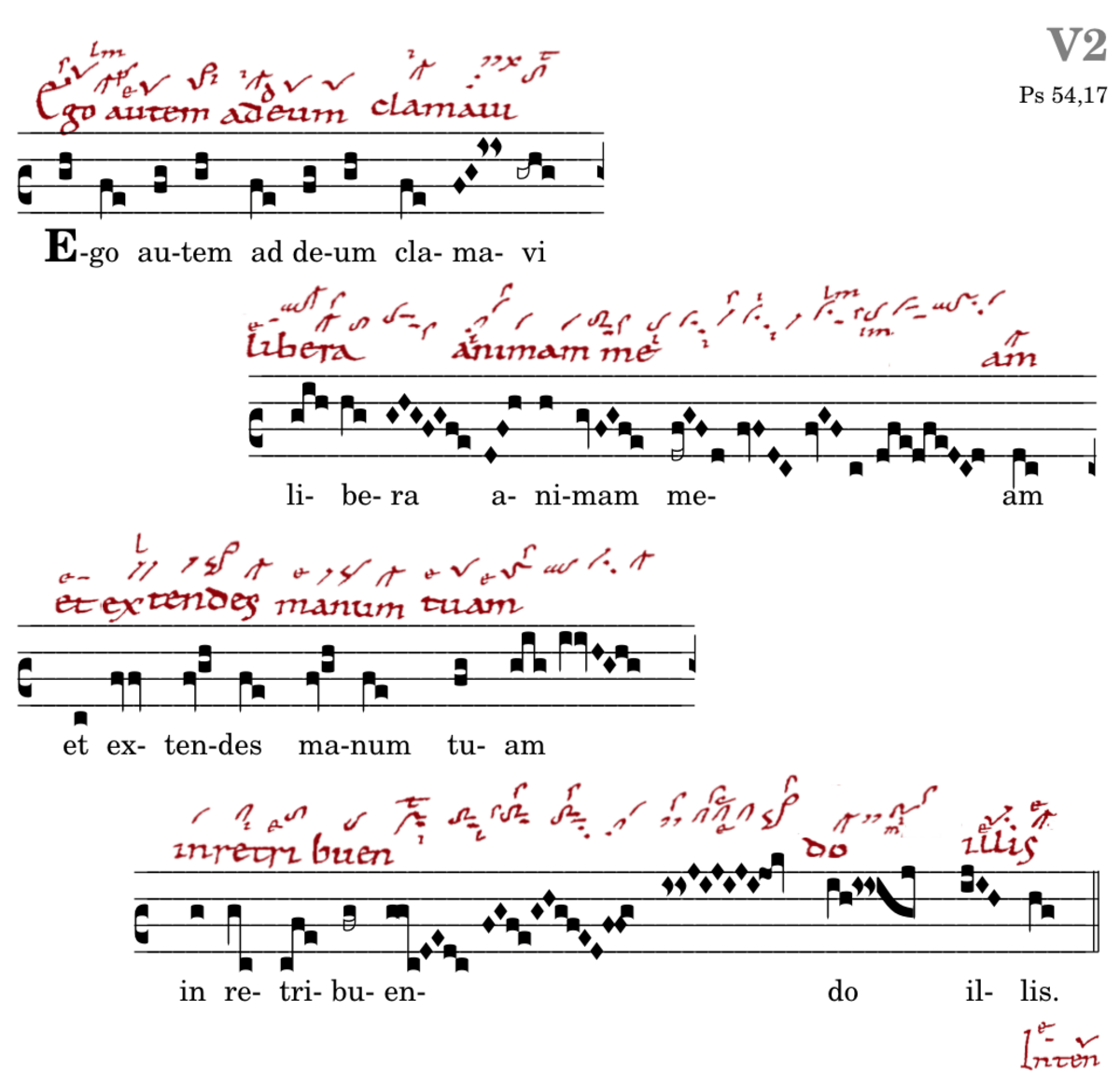 V2. Ego autem ad deum clamavi / libera animam meam / et extendes manum tuam / in retribuendo illis.