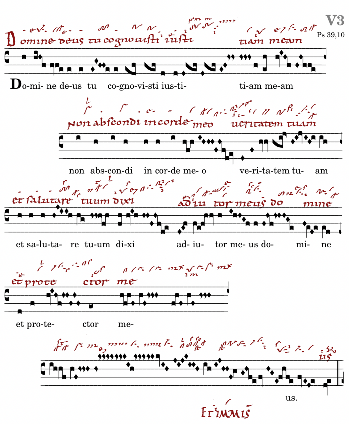 V3. Domine deus tu cognovisti iustitiam tuam / non abscondi in corde meo / veritiam tuam et salutare tuum dixit / adiutor meus domine et protector meus.