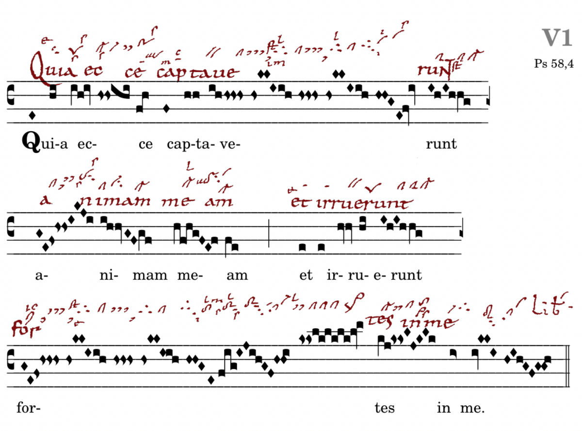 V1. Quia ecce captaverunt animam meam / et irruerunt fortes in me.