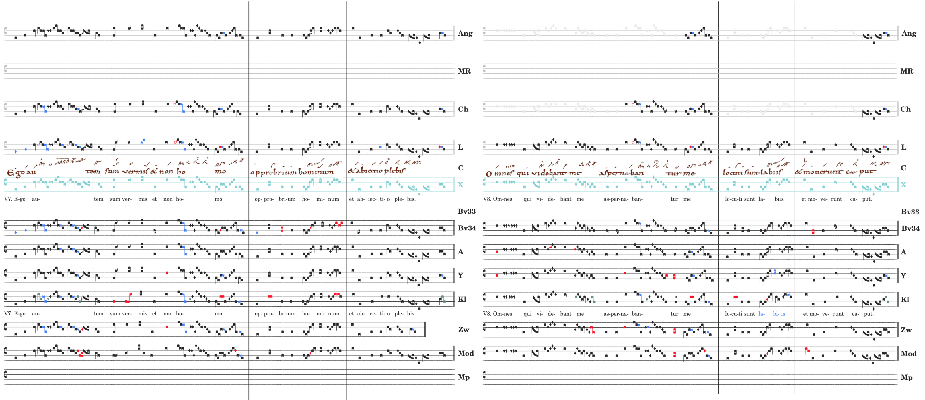 V7. Ego autem sum vermis / et non homo * opprobrium hominum / et abiectio plebis. V8. Omnes qui videbant me / aspernabantur me * locuti sunt labiis / et moverunt caput.