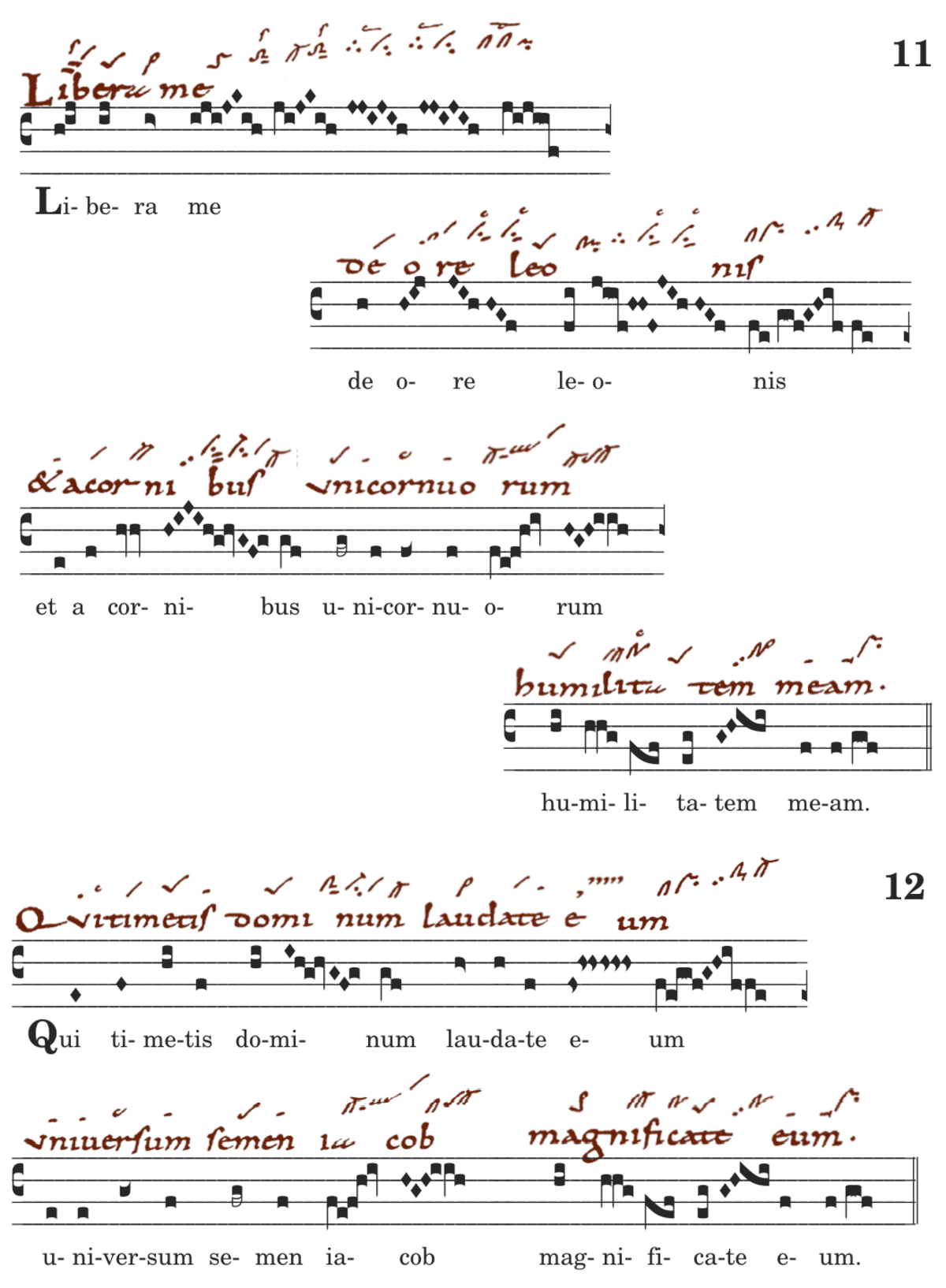 V11. Libera me / de ore leonis * et a cornibus unicornuorum / humilitatem meam. V12. Qui timetis dominum / laudate eum * universum semen iacob / magnificate eum.