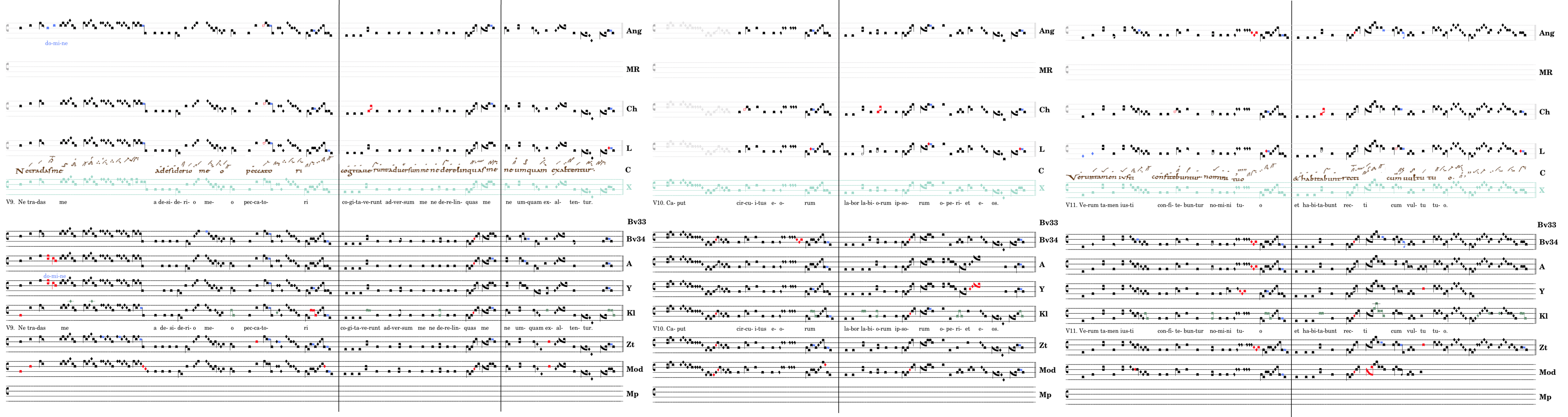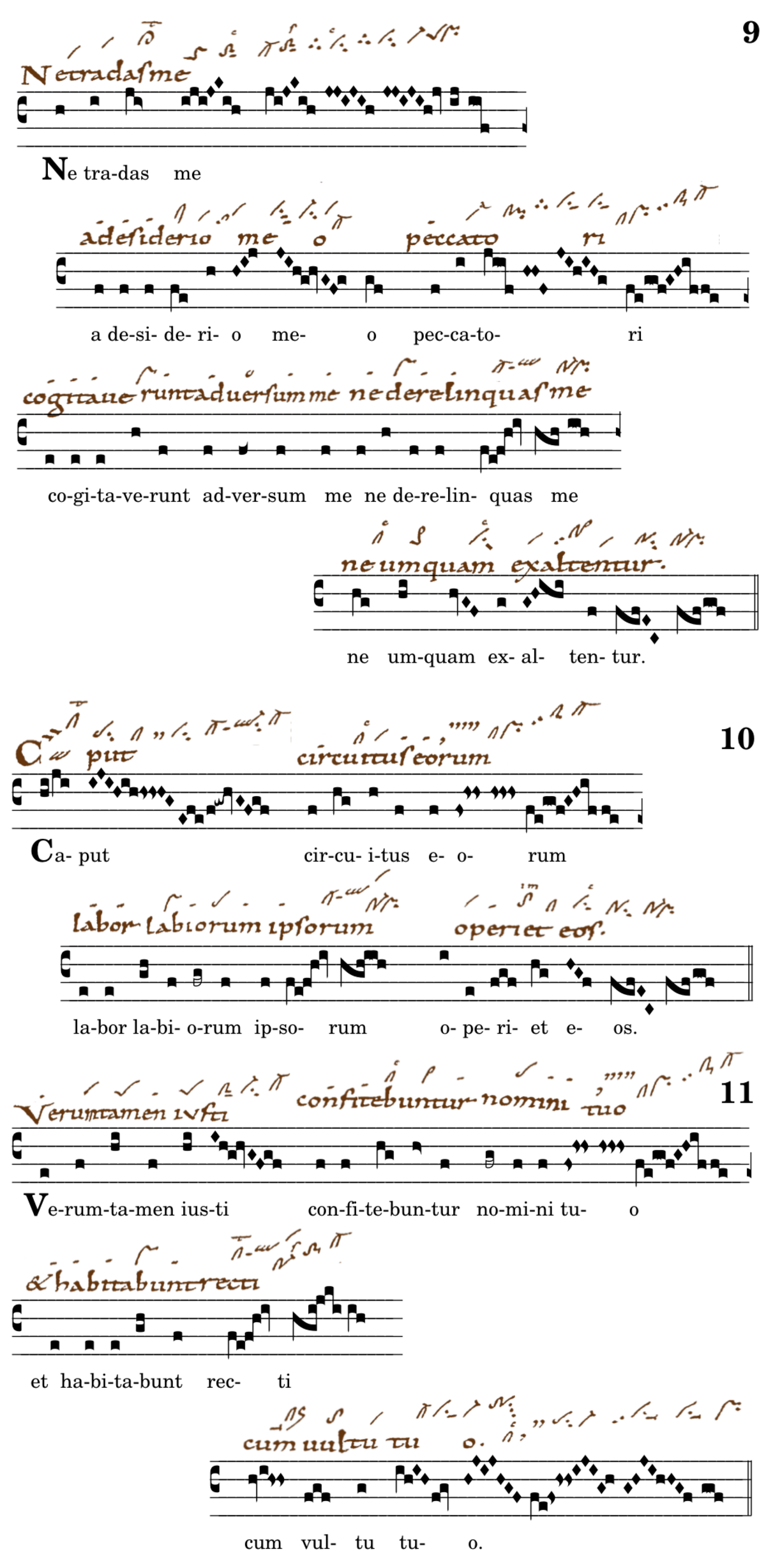 V9. Ne tradas me // a desiderio meo / peccatori * cogitaverunt adversum me ne derelinquas me / ne umquam exaltentur. V10. Caput / circuitus eorum labor * labiorum ipsorum / operiet eos. V11. Verum tamen / iusti confitebuntur nomini tuo * et habitabunt recti // cum vultu tuo.