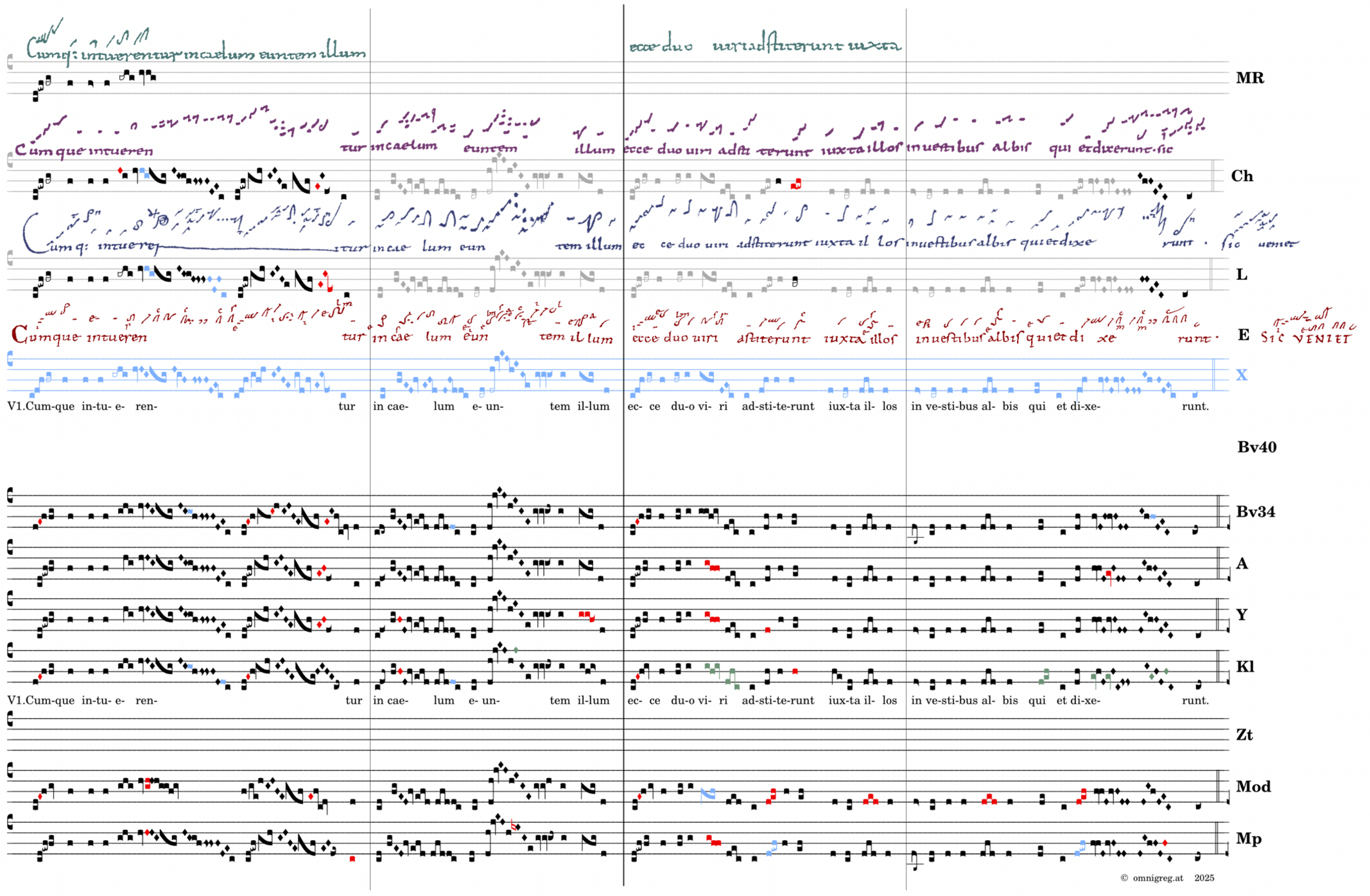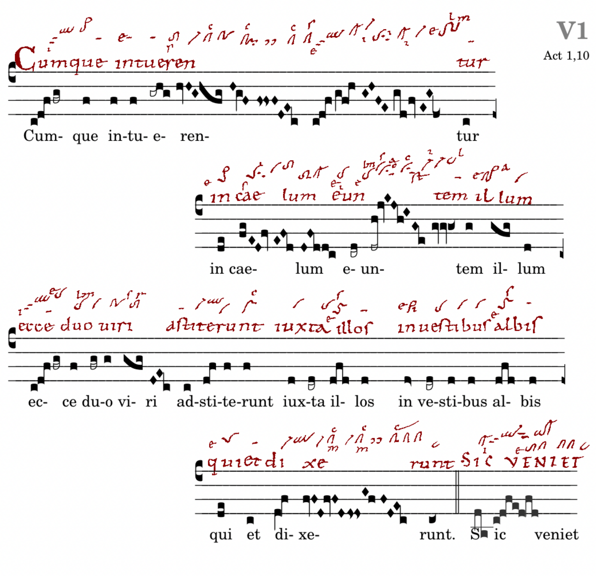 V1. Cumque intuerentur / in caelum eunte illum / ecce duo viri adstiterunt iuxta illos / in vestibus albis / qui et dixerunt.