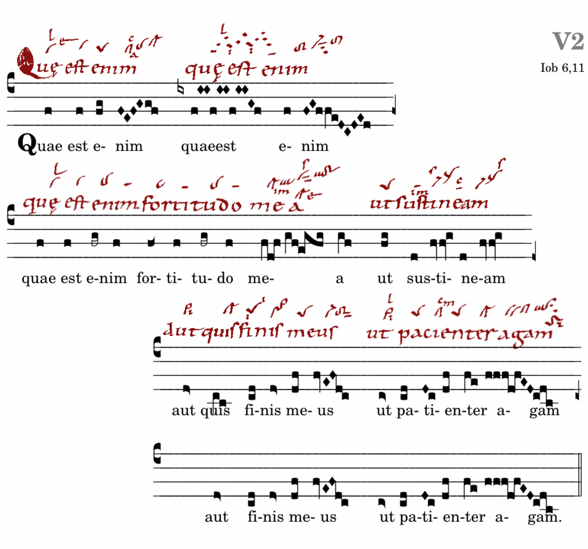 V2. Quae est enim quae est enim / fortitudo mea ut sustineam / aut quis finis meus ut patienter agam.