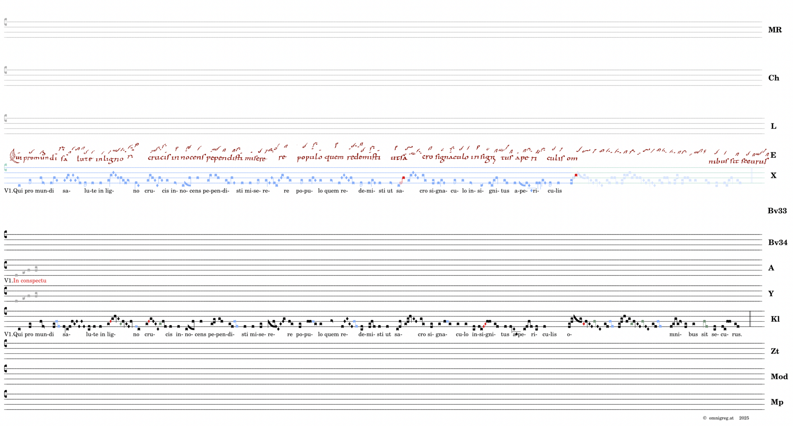 V1. Qui pro mundi salute in ligno crucis / innocens pependisti miserere populo / quem redemisti ut sacro signaculo / in signitus apericulis omnibus sit securis.