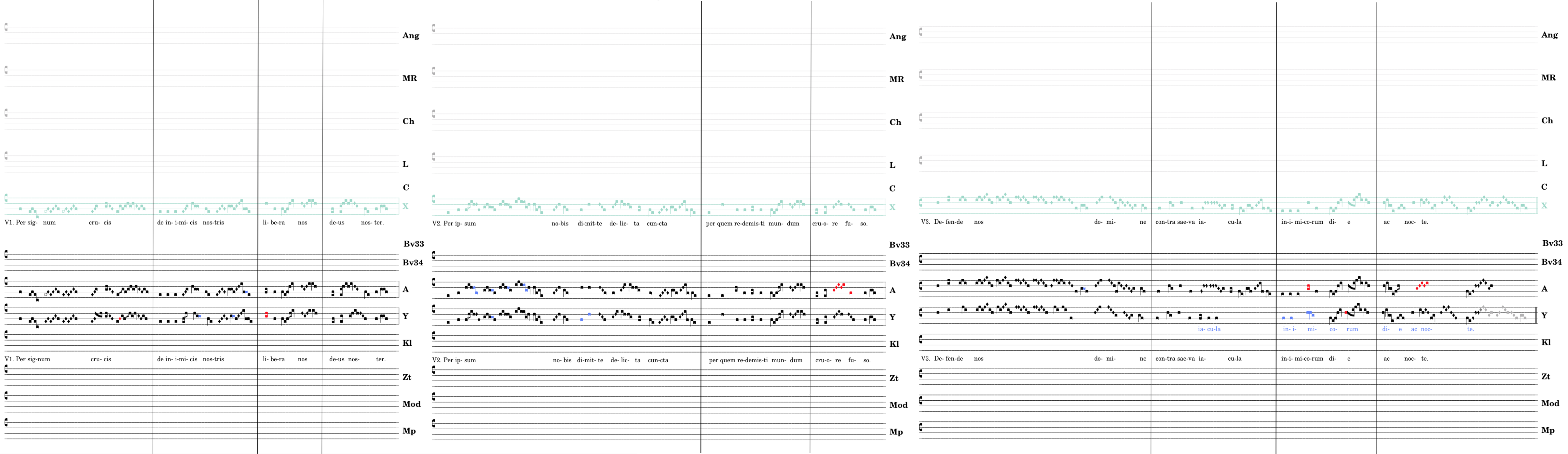 V1. Per signum crucis de inimicis nostris * libera nos deus noster. V2. Per ipsum nobis dimitte delicta cuncta * per quem redemisti mundum cruore fuso. V3. Defende nos domine contra saeva iacula inimicorum die ac nocte.