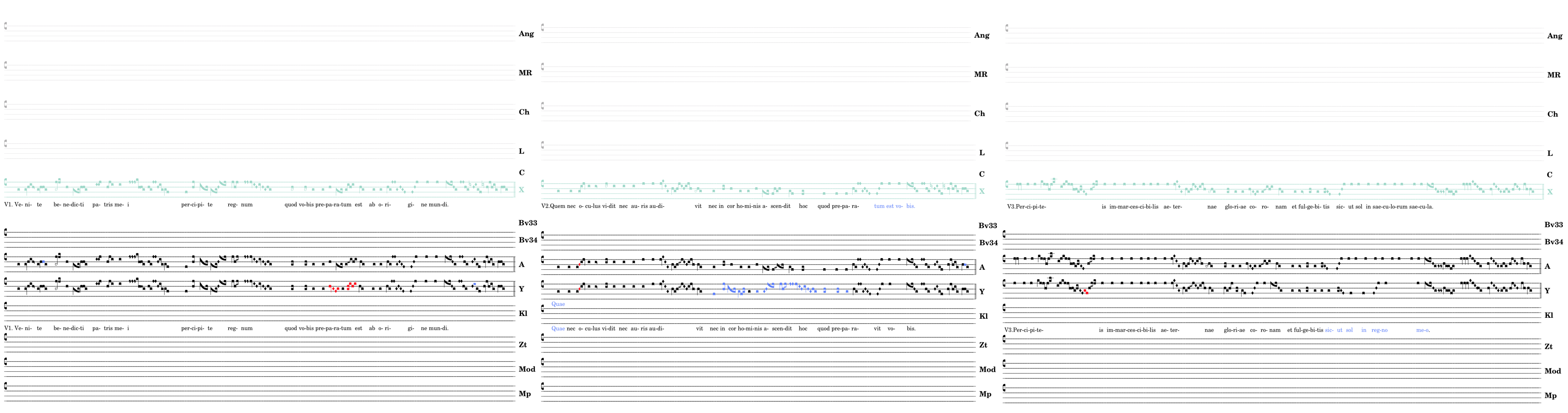 V1. Venite benedicti patris mei percipite regnum quod vobis preparatum est / ab origine mundi. V2. Quem nec oculus vidit / nec auris audivit * nec in cor hominis ascendit / quod preparavit vobis. V3. Percipitis immarcescibilis / aeternae gloriae coronam * et fulgebi/tis sicut sol in regno meo.