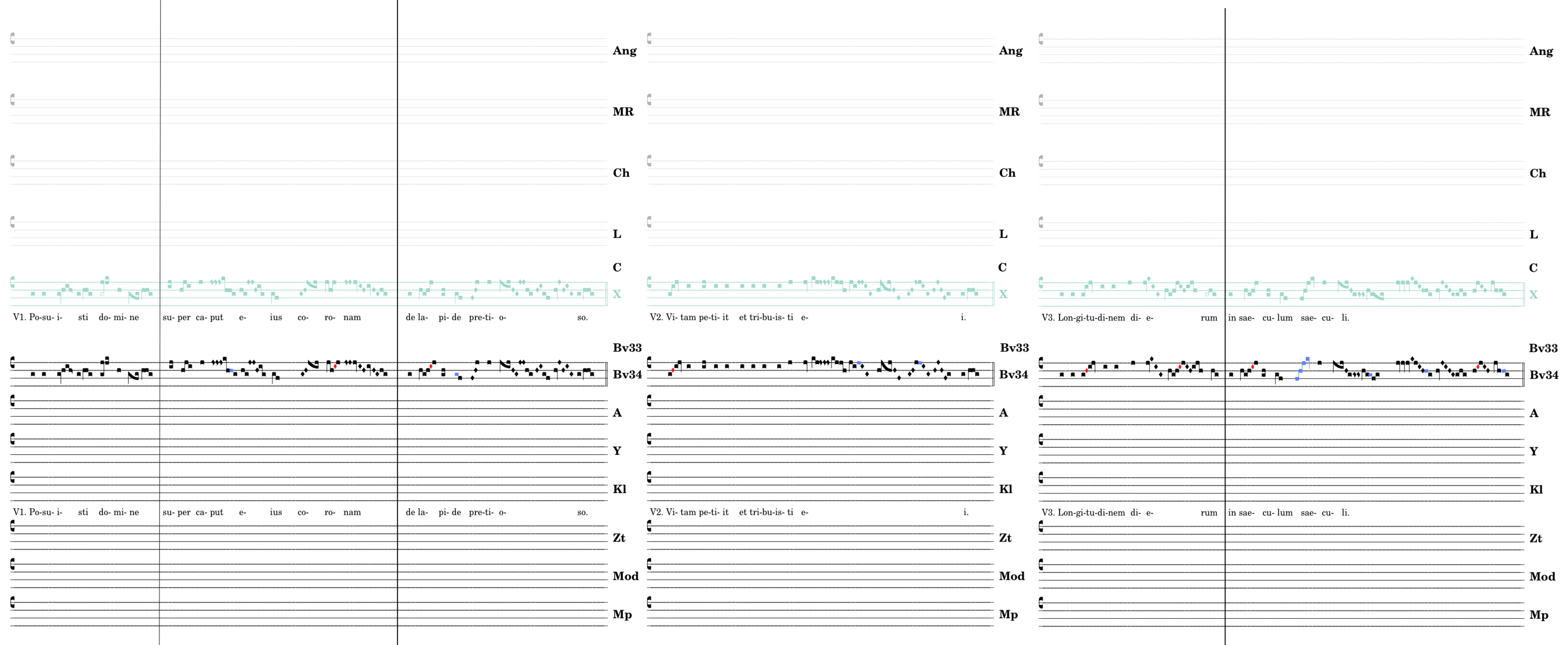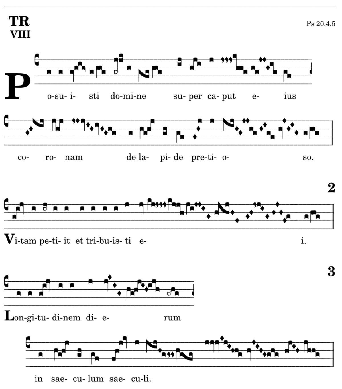 V1. Posuisti domine super caput eius * coronam de lapide pretioso. V2. Vitam petiit et tribuisti ei. V3. Longitudinem dierum in saeculum saeculi.
