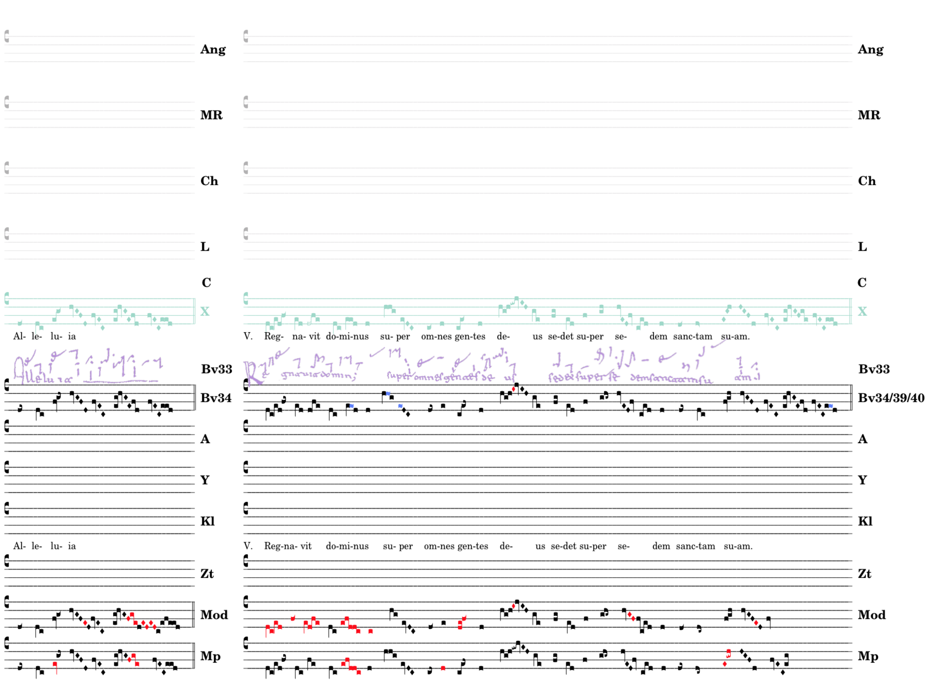 Im Gegensatz zum GRnov stützen wir uns nicht auf Mp, wohl eine Verneigung vor Solesmes, sondern edieren die Fassung von Bv, das die Melodie zurück bis an den Beginn des 11. Jh. belegt (Bv34 → Bv39 → Bv40 → Bv33). Darüber hinaus berufen wir uns auf R. Fischer, der immer wieder einforderte, sich im melodischen Zweifelsfall doch auf Bv zu stützen.