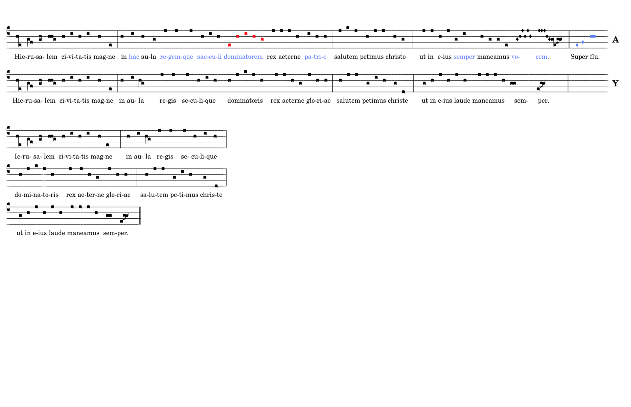 Ierusalem civitatis magne / in aula regis seculique dominatoris / Rex aeterne gloriae / salutem petimus christe / ut in eius laude / maneamus semper.