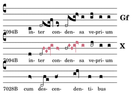 Die erste circulatio ist in Ka zum fa zurechtgebogen, sie als Korrektur einer 'circulatio-mi' zu verstehen ist logisch (Gf), aber der Verlauf der Standardmelodie spricht für 'circulatio-fa'.
