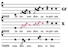Die erste circulatio ist in Ka zum fa zurechtgebogen, sie als Korrektur einer 'circulatio-mi' zu verstehen ist logisch (Gf), aber der Verlauf der Standardmelodie spricht für 'circulatio-fa'.