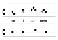 n Der erste Teil ist ein nullum, Rezitation „do“, die Akzentsilbe steigt zum „re“. Das Wort „nó-men“ ist auf beiden Silben mit Trc geschmückt, auf der Akzentsilbe wie immer mit kTrc, auf der Endsilbe mitTrcFIN.