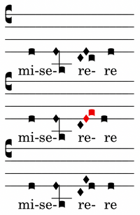 „miserére méi“ ist zwar wegen der CAD 4E accentus if, aber der Trc bei „miserére“ sieht aus, als ob er ein Trc accentus i wäre, dann ist der Cento als „miserére méi“ zu verstehen, durchaus sinnvoll. Der Trc ist in Bv2 und Ka (a.m.) „do-re-do“, ebenso in AM und Gf. Leider fehlen MR, Bv1,Mc und die Toledaner. Wc,Lc, Wm führen eine Sca zum „mi“ („do-re-mi“)! Argumentation: Alle vorliegenden Quellen sind unter dem Einfluss der plerosis und vermeiden Tonwiederholung, daher kann für sie auf „misere-re“ kein „re“ stehen. In Wc, Lc, Wm ist aber noch das Wissen um den Aufstieg zu „mi“ vorhanden. Indem man den Terzsprung „do-mi“ auffüllt (plerosis), ist auch noch die ursprüngliche Tonanzahl gerettet. cf.: 7741.
