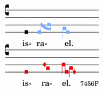 Das Wort „ísrael“ müsste wie oben vertont sein: TrcRes + Clv mit superveniens anticipata. Nun ist der Name „israel“ aber hebräisch, damit auf der letzten Silbe betont „israél. Dementsprechend ist die CAD micro abgewandelt. „Is-“ Die superveniens bleibt (oder ist es der abgespaltete erste Ton des TrcRes ?); die Binnensilbe “-ra-„ behält den Mittelteil des TrcRes, die Clivis „fa-mi“; die Clivis der Schlussilbe/Akzentsilbe “-el„ erhält zusätzlich den Artikulationston des TrcRes, das „fa“ + ein verbindendes „re“, womit ein Artikulationstorulus nach dem Akzentton „fa“ entsteht, siehe unten.