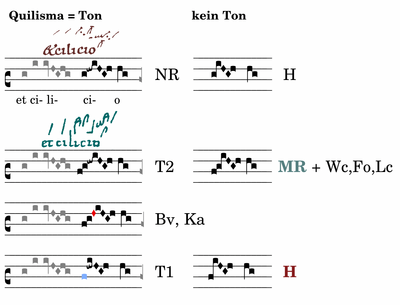 „cili-ci-o“ Auf den ersten Blick Unterschied zwischen MR + H, MR ein Ton mehr.NR löst die Stelle mit Blick auf (nur!) H mit Anstieg „re-fa“. Hier spielen aber die Frage nach der Deutung des Quilisma und die Plorasis eine Rolle. Alle diastematischen Quellen beginnen die Neume mit „do“, auch Ka + Tol, es gibt also keinen Unterschied zwischen frOc + frOr: NR hat keine Begründung in den Quellen. Das Quilisma steht sicher für „mi“ MR etc., dann sind aber Wc, Fo, Lc Zeugen dafür, dass das Quilisma kein Ton ist, oder das „re“ wird als Übertragung des Quilisma verstanden, dem widerspricht T2. T1 ist der Schlüssel: im Aufstieg nur 3 Zeichen ( „do“ + „fa“ + Quilisma ), alles andere ist am der Quilismadeutung entlang eingeschlichene Plorasis.