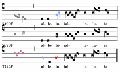 Das einem spannungsarmen Text nachgeschobene „alleluia“ ist ebenfalls kein Spannungshöhepunkt, daher CAD Ω mikro. Die Melodie ist für den Text „alleluia“ weitere Male verwendet. vide: 7199, 7676.